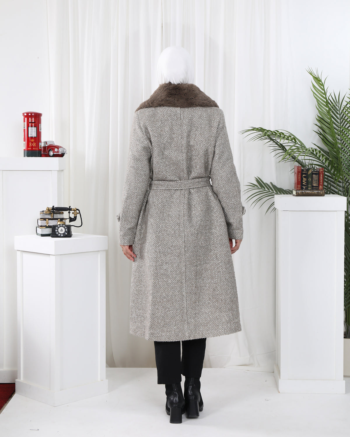Belted Soft Felt Trench Coat with Faux Fur Collar – Taupe Grey