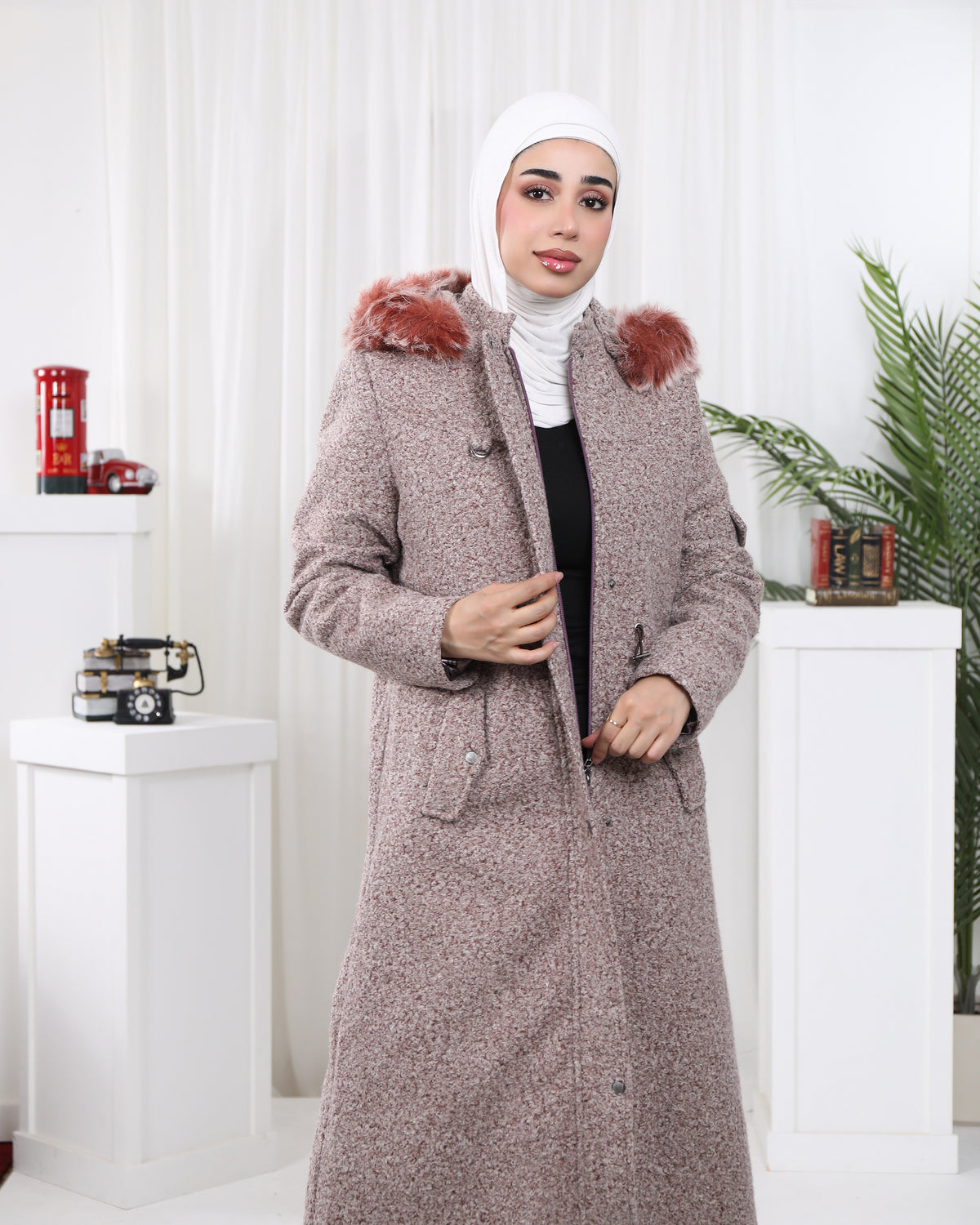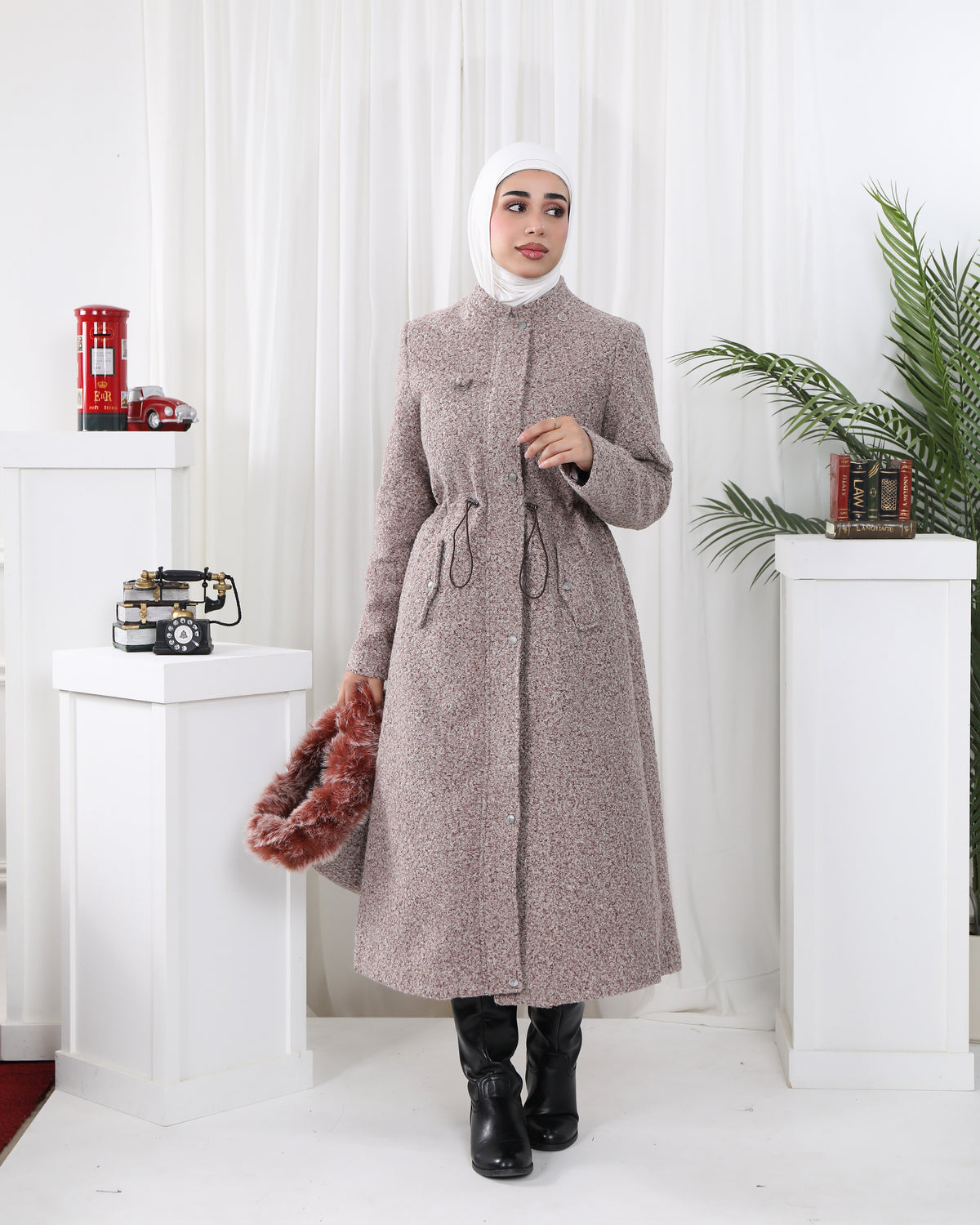 Elegant and effortlessly feminine, this textured jacket features a subtle rose-taupe hue with a soft faux fur accent. The drawstring waist defines the silhouette, while the button-down front and longline cut provide both comfort and sophistication. A graceful choice for refined winter layering.
