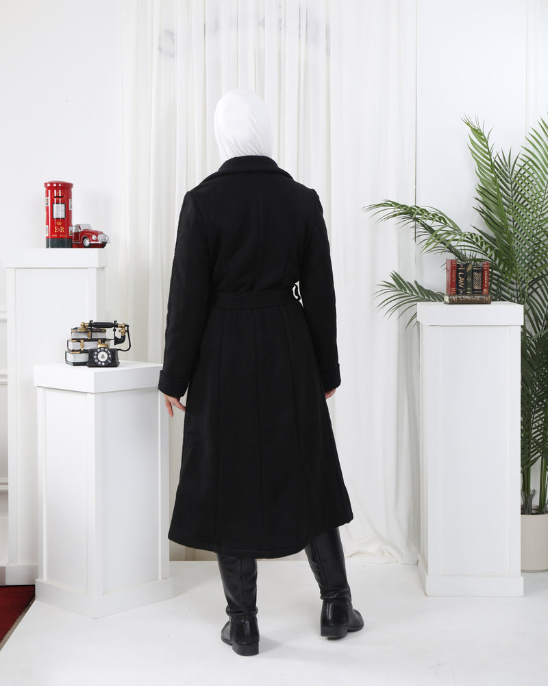 Wool-Felt Trench Coat with Faux Fur Collar – Black & Beige