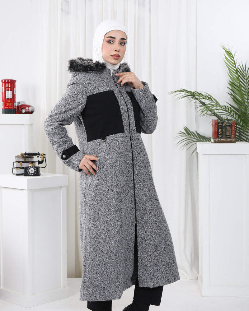 Fur Hooded Contrast Panel Felt Jacket – Grey & Black