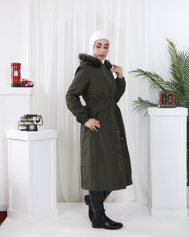 Wool-Felt Trench Coat with Faux Fur Collar – Olive Beige