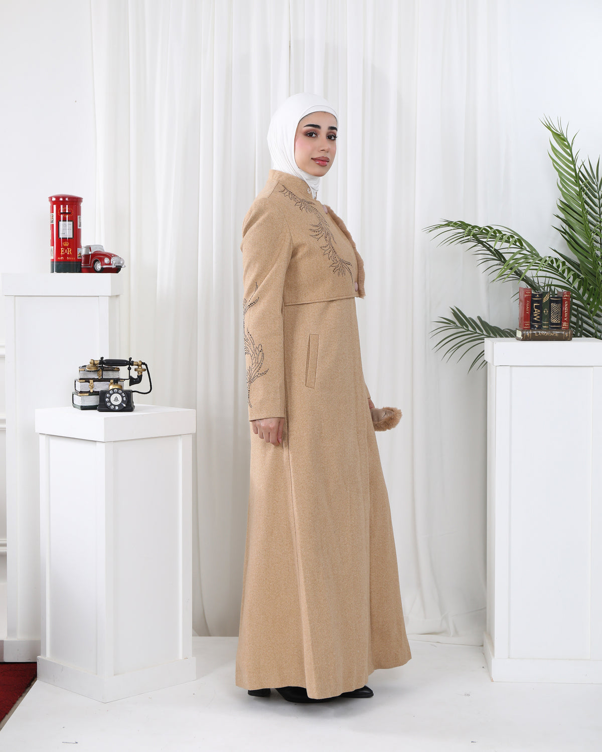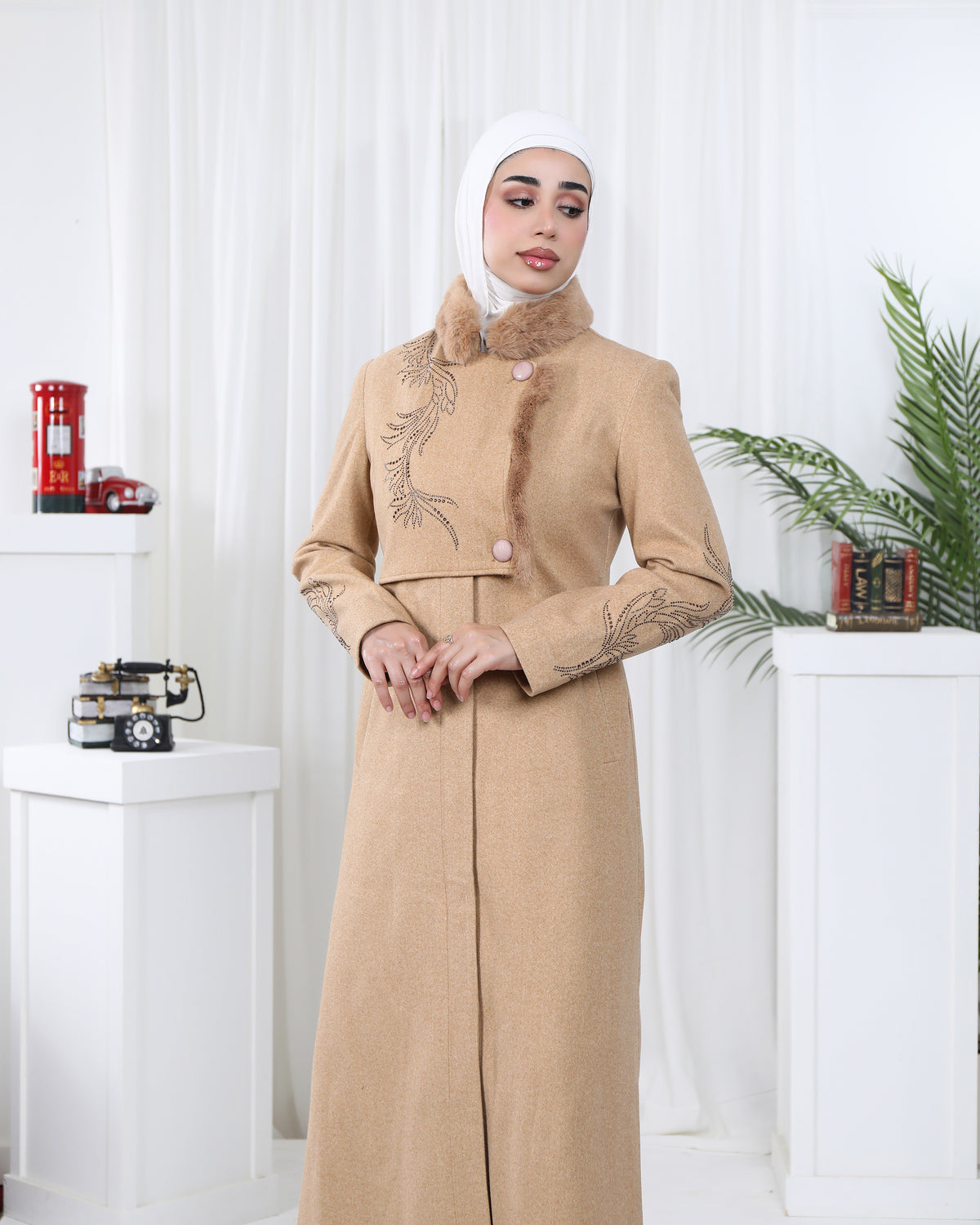 Designed for timeless sophistication, this soft felt trench coat features delicate embroidery along the front and sleeves, adding a graceful feminine touch. Its long silhouette, structured fit, and smooth texture create a refined winter look that blends warmth with elegance.