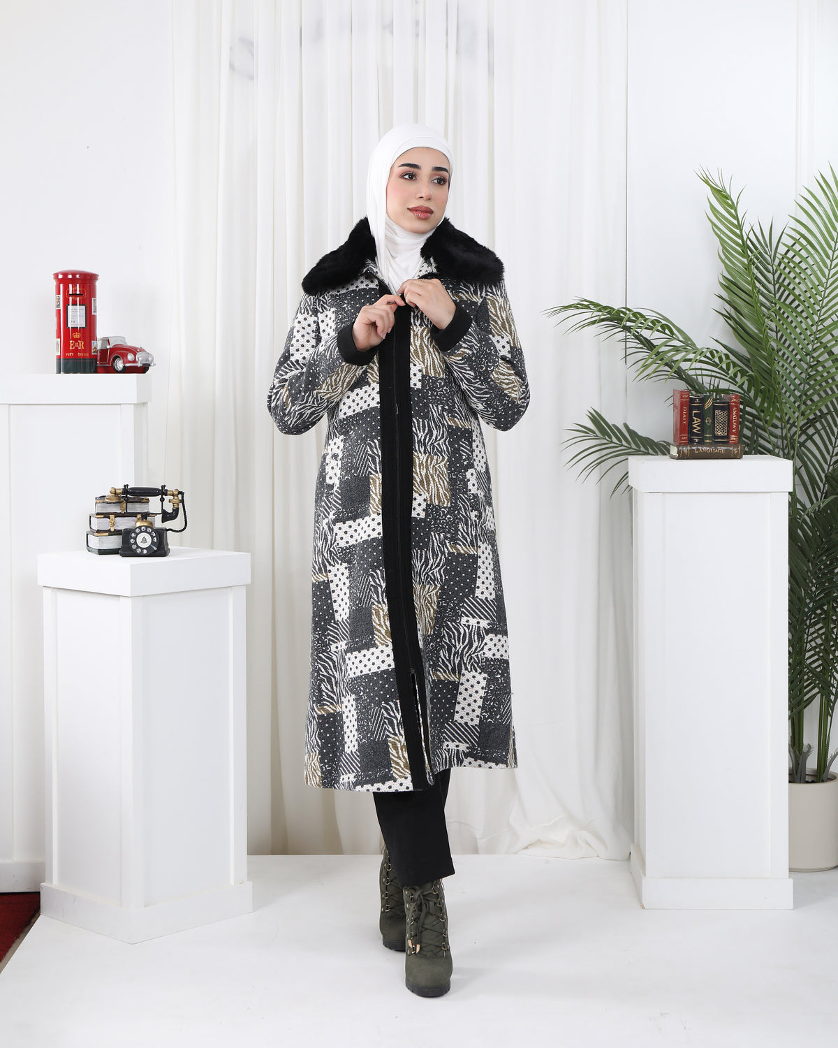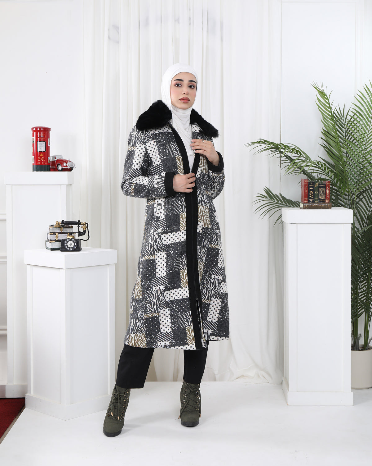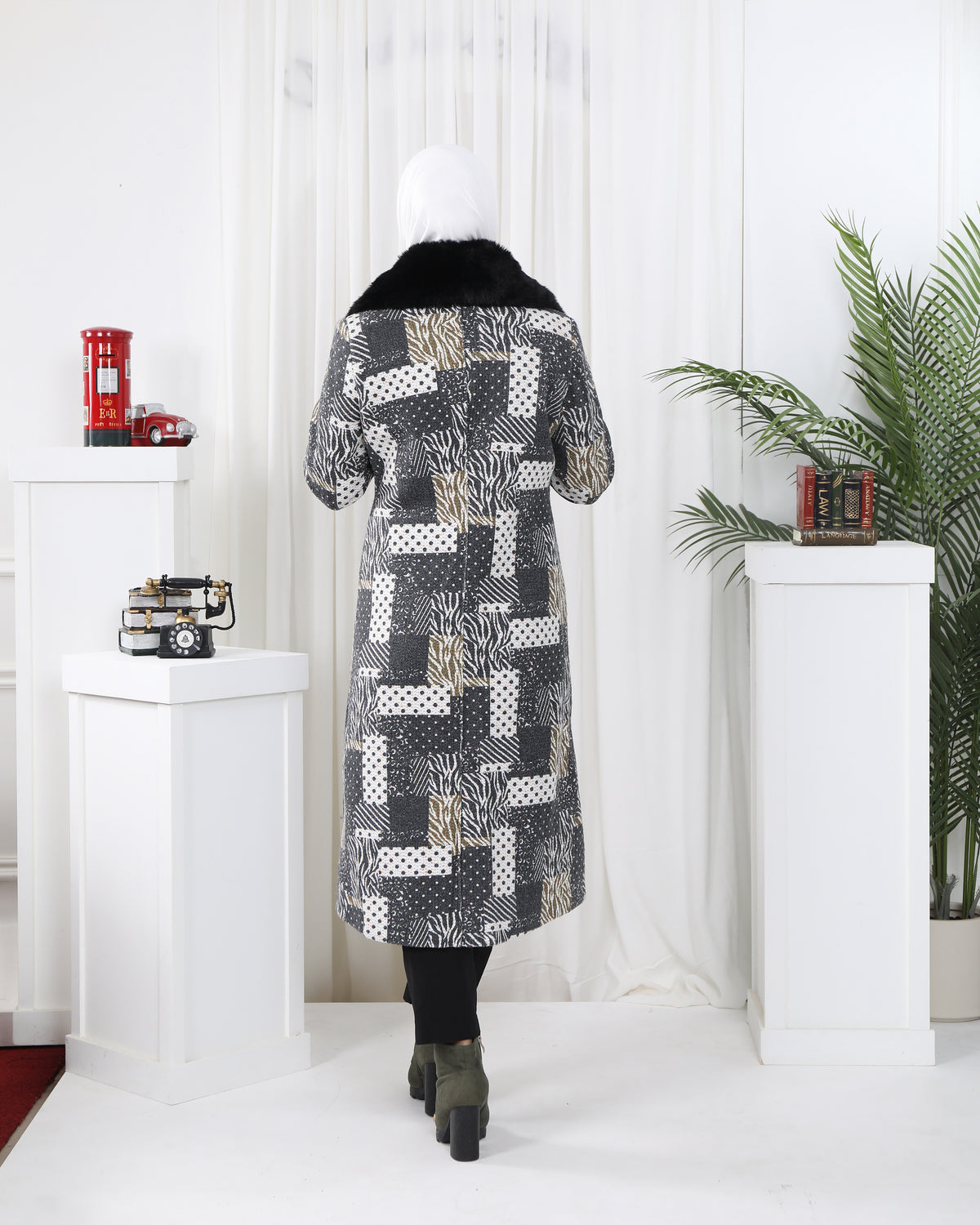 Wool-Felt Trench Coat with Faux Fur Collar – Black & Beige